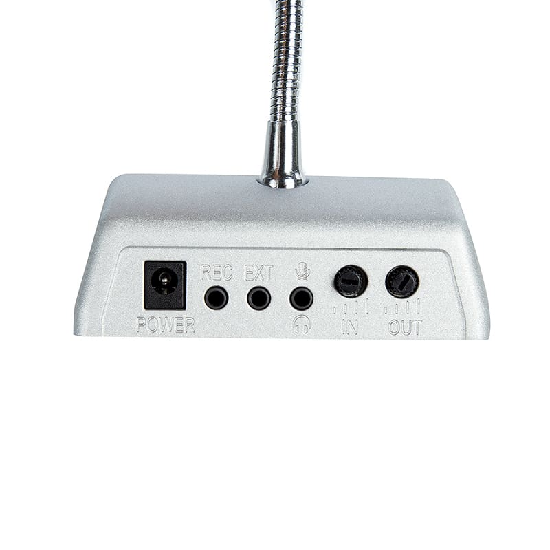 در نمای پشتی یونیت اصلی به ترتیب و از سمت چپ به راست پورت های زیر رو در اختیار دارید: ورودی منبع تغذیهی ولتاژ مستقیم 12 ولتی، کلید راکر روشن و خاموش کردن دستگاه، خروجی شنود و یا ضبط صدای مکالمات، خروجی اکستنشن یا همون یونیت فرعی و در نهایت .ر.دی میکروفون اکسترنال یقه ای.