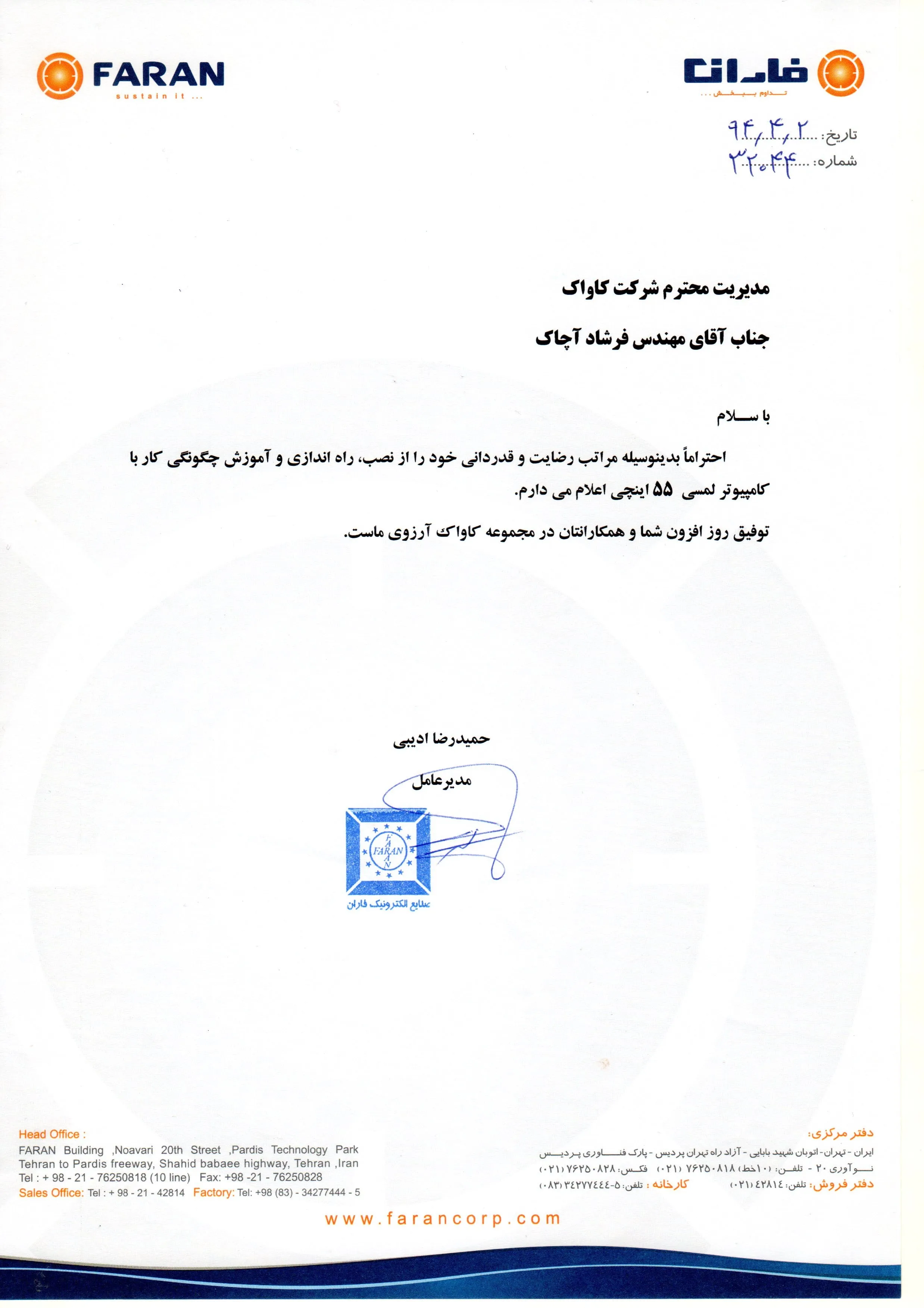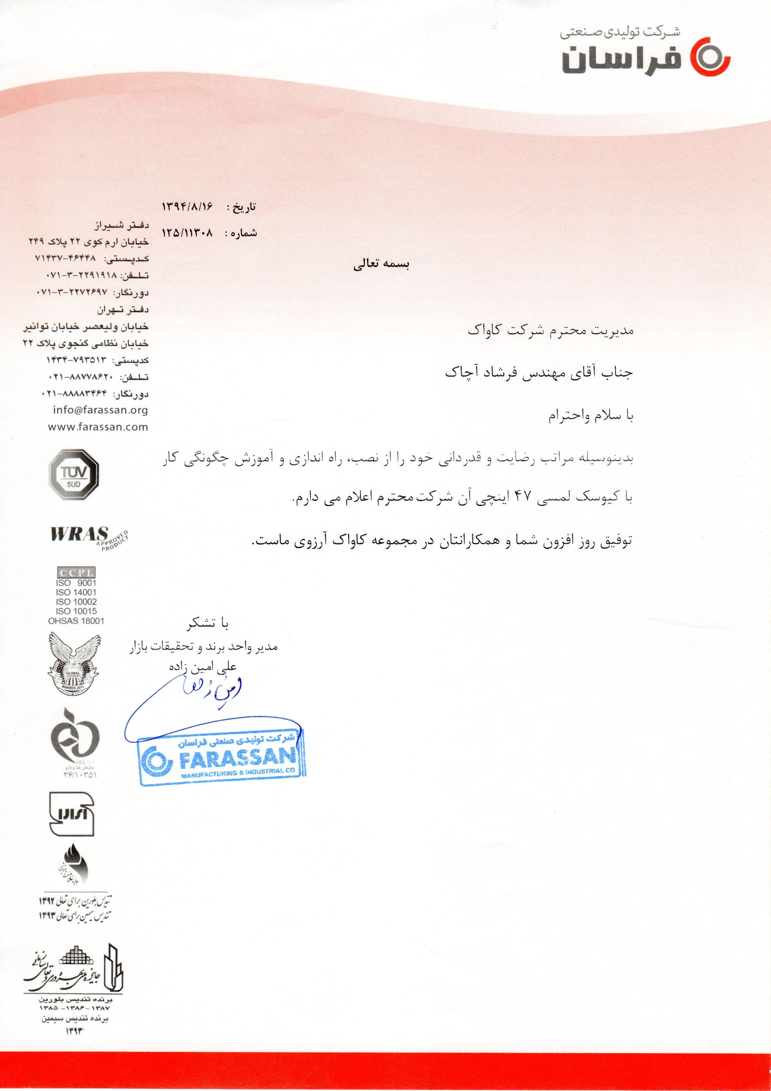مفتخریم که علی رغم تاسیس در بحرانی ترین شرایط تاریخ اقتصادی ایران و در خلال بحران های دههی نود شمسی، نه تنها گستره ی محصولات و فعالیت های خود را محدود نکردیم بلکه به کمک اعتماد مشتریان و شبکه ی همکاران و نمایندگان، محصولات و خدمات خود را تا حدودی گسترده تر نیز کرده ایم.